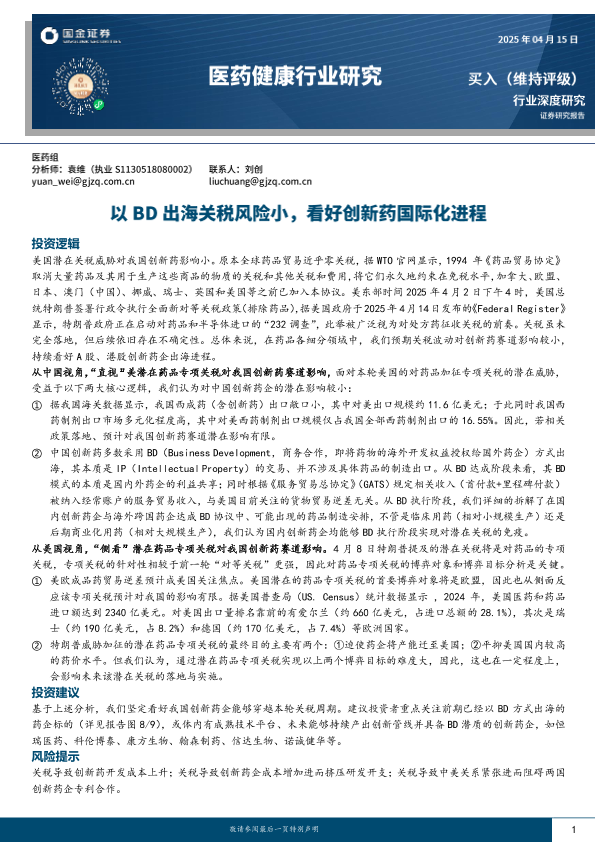 【国金证券】【20250415】医药健康行业深度研究:以BD出海关税风险小,看好创新药国际化进程-17页