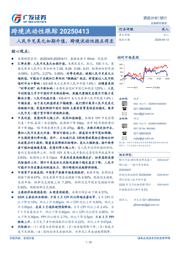 【广发证券】【20250413】银行业跨境流动性跟踪:人民币兑美元如期升值,跨境流动性拐点将至-25页