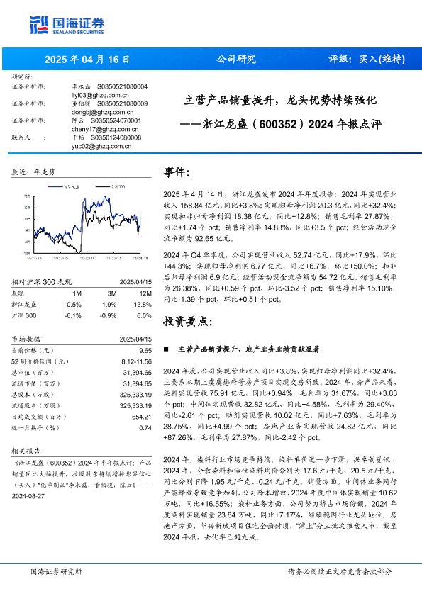 【国海证券】【20250416】浙江龙盛(600352)2024年报点评:主营产品销量提升,龙头优势持续强化-11页