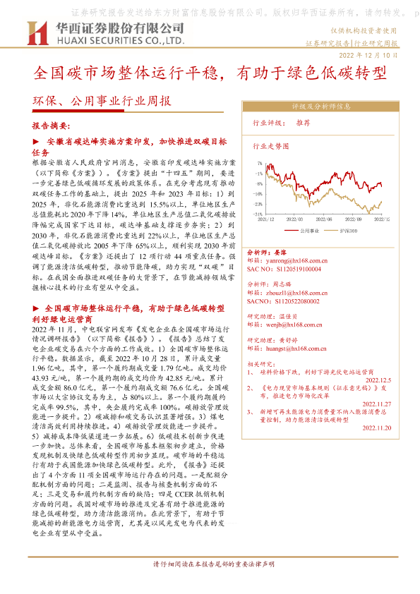 【华西证券】【20221210】环保、公用事业行业周报:全国碳市场整体运行平稳,有助于绿色低碳转型-18页