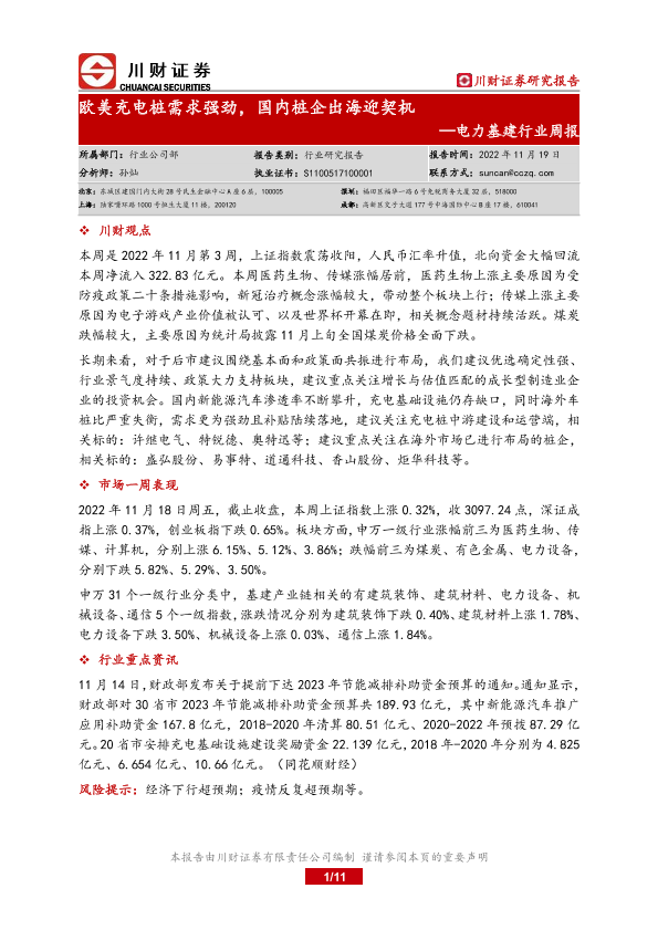 【川财证券】【20221119】电力基建行业周报:欧美充电桩需求强劲,国内桩企出海迎契机-11页