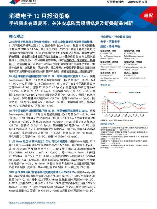 【国信证券】【20221212】电子行业投资策略:消费电子12月投资策略,手机需求有望复苏,关注安卓阵营预期修复及折叠新品创新-23页