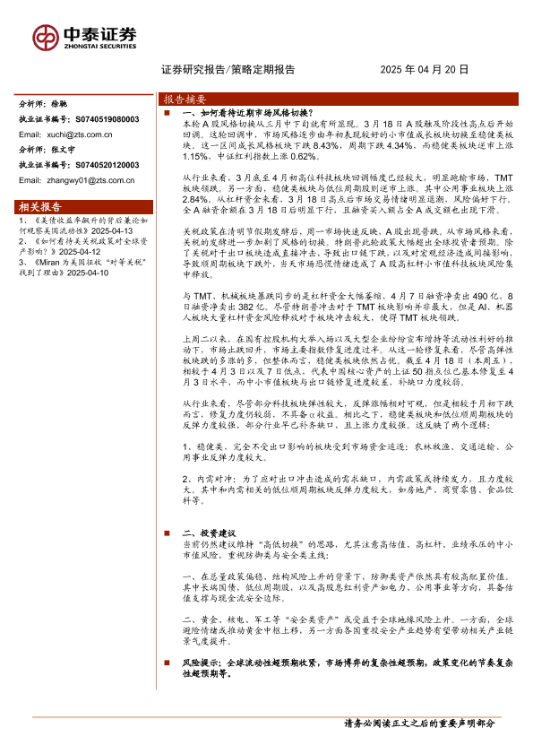 【中泰证券】【20250420】策略定期报告:如何看待近期市场风格切换?-14页