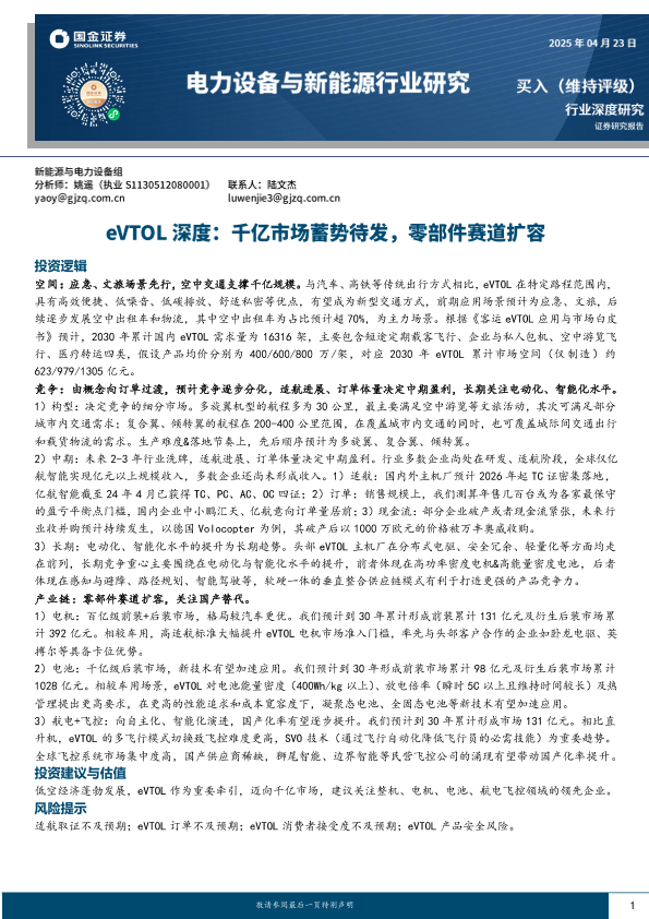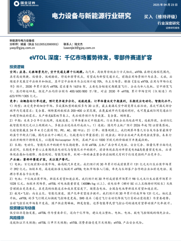 【国金证券】【20230425】电力设备与新能源行业研究:eVTOL深度,千亿市场蓄势待发,零部件赛道扩容-28页