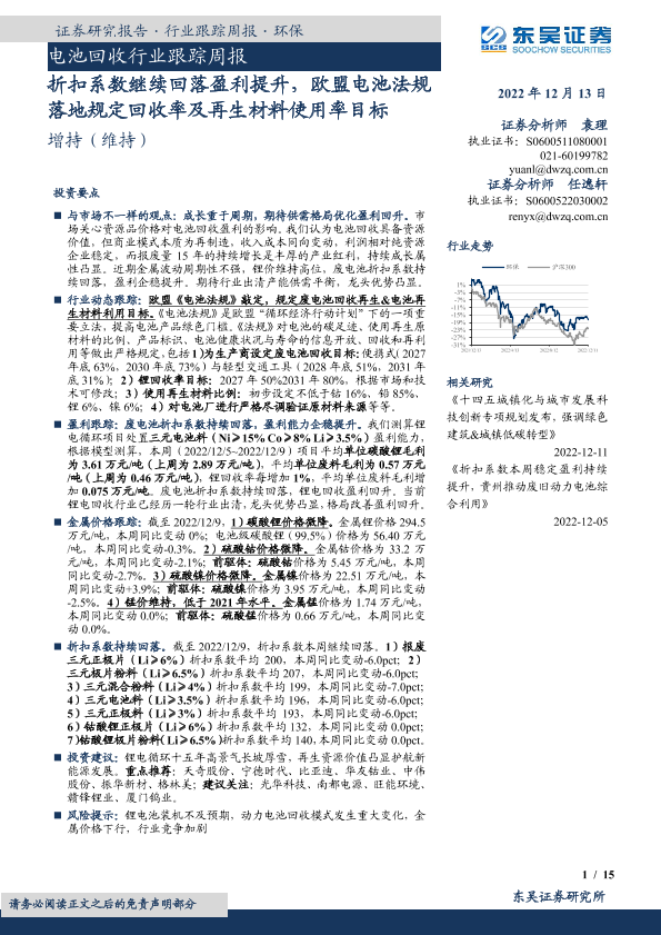 【东吴证券】【20221213】电池回收行业跟踪周报:折扣系数继续回落盈利提升,欧盟电池法规落地规定回收率及再生材料使用率目标-15页