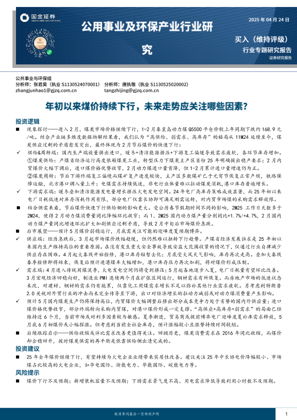 【国金证券】【20240425】公用事业及环保产业行业研究:年初以来煤价持续下行,未来走势应关注哪些因素?-27页