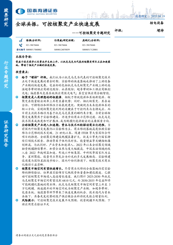 【国泰海通证券】【20250419】核电设备行业可控核聚变专题研究:全球共振,可控核聚变产业快速发展-30页