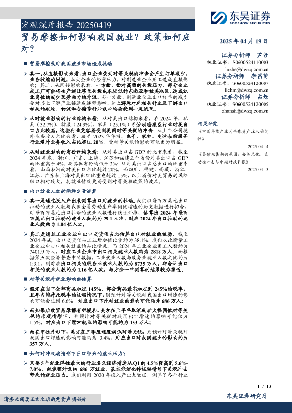 【东吴证券】【20250419】贸易摩擦如何影响我国就业?政策如何应对?-13页