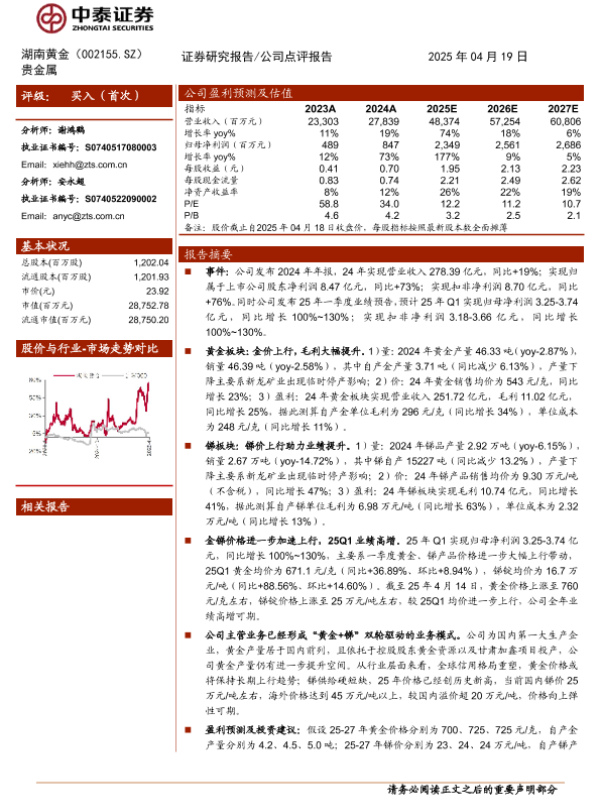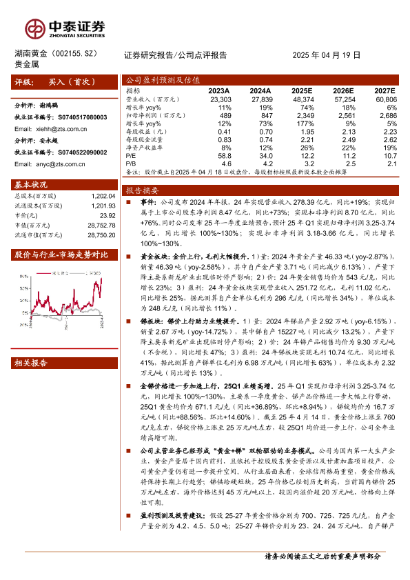【中泰证券】【20250419】湖南黄金(002155)金锑共振上行,业绩高增可期-14页