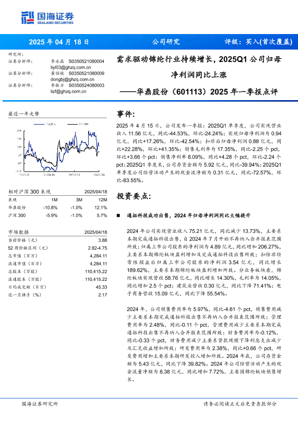 【国海证券】【20250418】华鼎股份2025年一季报点评:需求驱动锦纶行业持续增长-11页