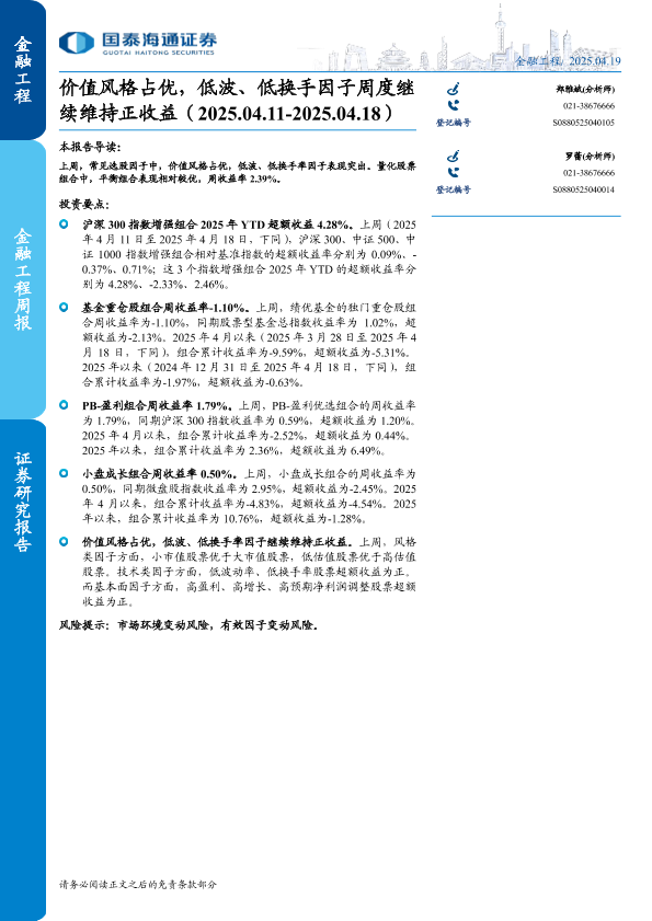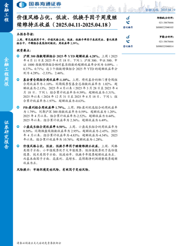 【国泰海通证券】【20250419】价值风格占优,低波、低换手因子周度继续维持正收益-11页
