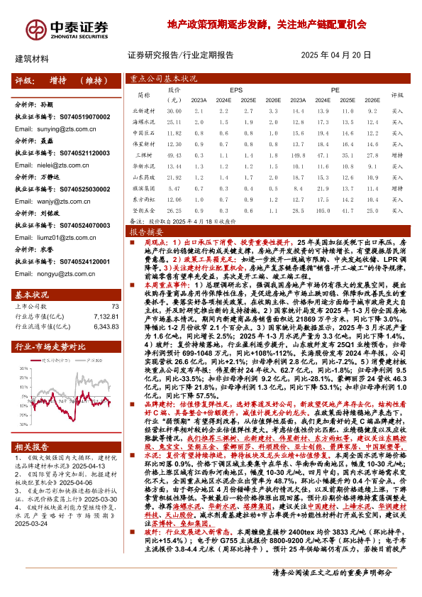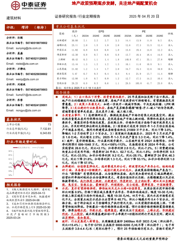 【中泰证券】【202504】建筑材料行业:地产政策预期逐步发酵,关注地产链配置机会-19页