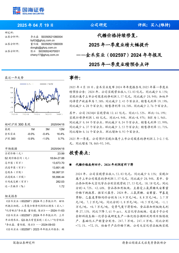 【国海证券】【20250419】金禾实业2024年年报及2025年一季度业绩预告点评-10页