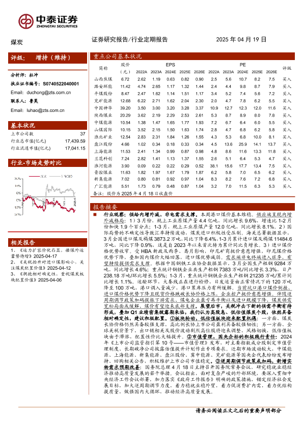 【中泰证券】【20250419】煤炭行业:Q1业绩密集披露期来临,关注相对确定性机会-23页