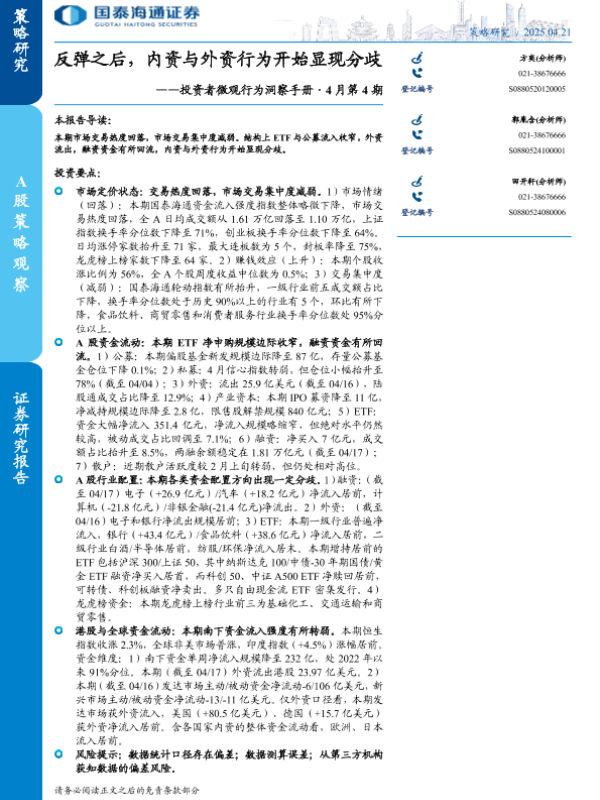 【国泰海通证券】【20250421】投资者微观行为洞察手册4月第4期:反弹之后,内资与外资行为开始显现分歧-33页