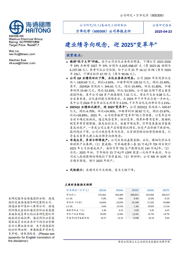 【海通国际】【20250421】万华化学(600309)公司季报点评:建业绩导向观念,迎2025“变革年”-14页