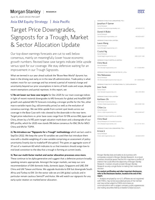 【Morgan Stanley】【202504】Asia EM Equity Strategy Target Price Downgrades, Signposts for a Trough, Market & Sector Allocation Update-65页