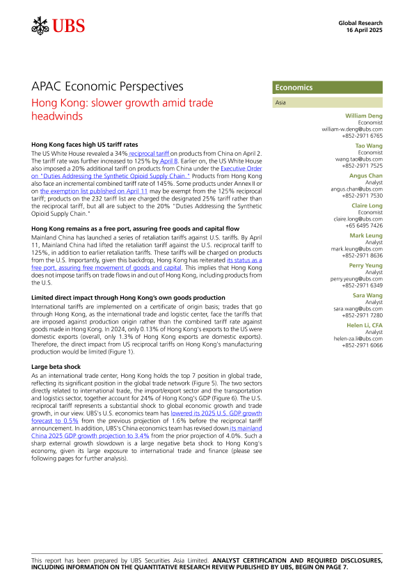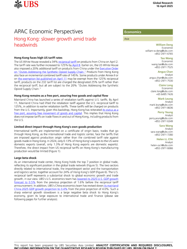 【UBS Securities Asia Limited】【20250416】APAC Economic Perspectives Hong Kong slower growth amid trade headwinds-10页