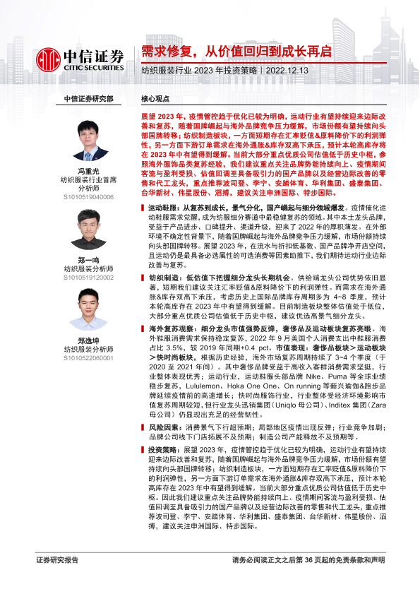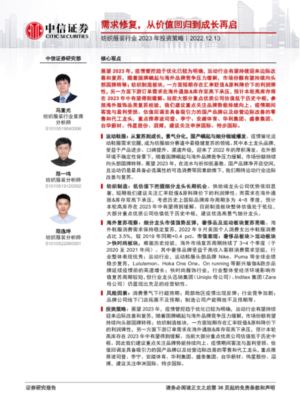 【中信证券】【20221213】纺织服装行业2023年投资策略:需求修复,从价值回归到成长再启-37页