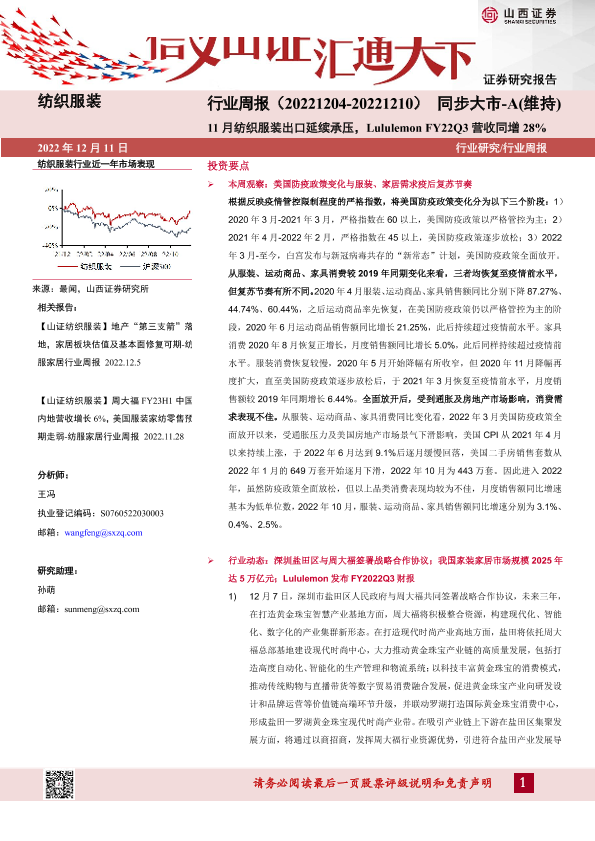 【山西证券】【20221211】纺织服装行业周报:11月纺织服装出口延续承压,Lululemon FY22Q3营收同增28%-22页
