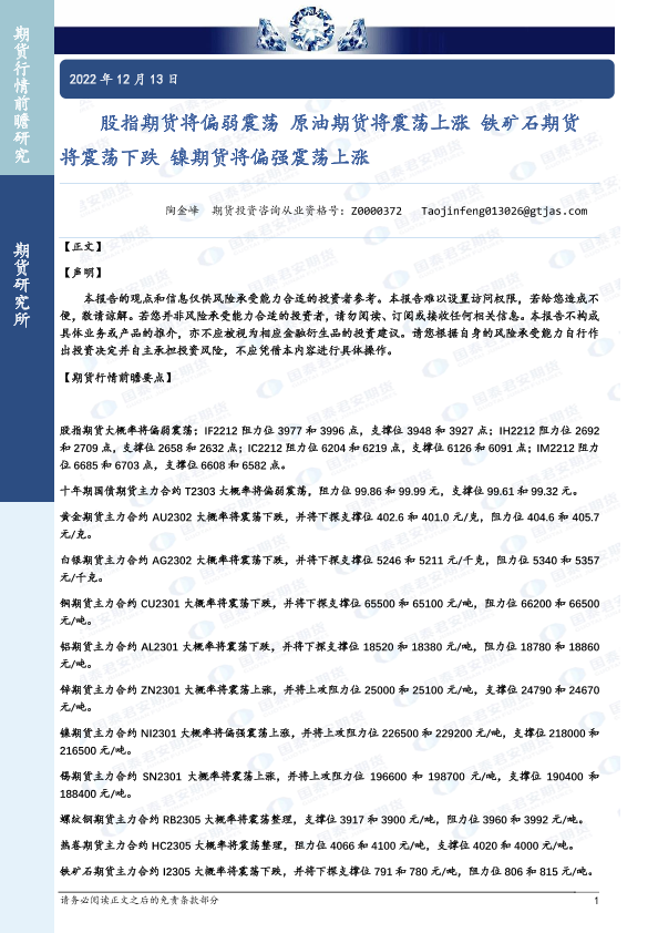 【国泰君安期货】【20221213】股指期货将偏弱震荡,原油期货将震荡上涨,铁矿石期货将震荡下跌,镍期货将偏强震荡上涨-39页