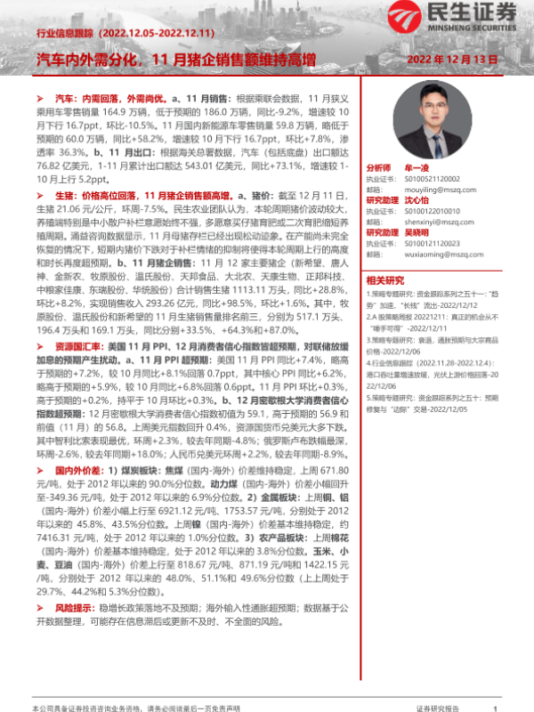 【民生证券】【20221213】行业信息跟踪:汽车内外需分化,11月猪企销售额维持高增-28页