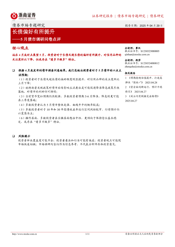 【浙商证券】【20250429】5月债市调研问卷点评:长债偏好有所提升-11页
