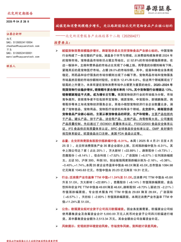 【华源证券】【20250428】北交所消费服务产业跟踪第十二期:城镇宠物消费规模稳步增长-12页