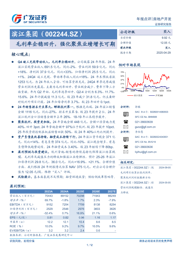 【广发证券】【20250429】滨江集团(002244)毛利率企稳回升,强化聚焦业绩增长可期-12页