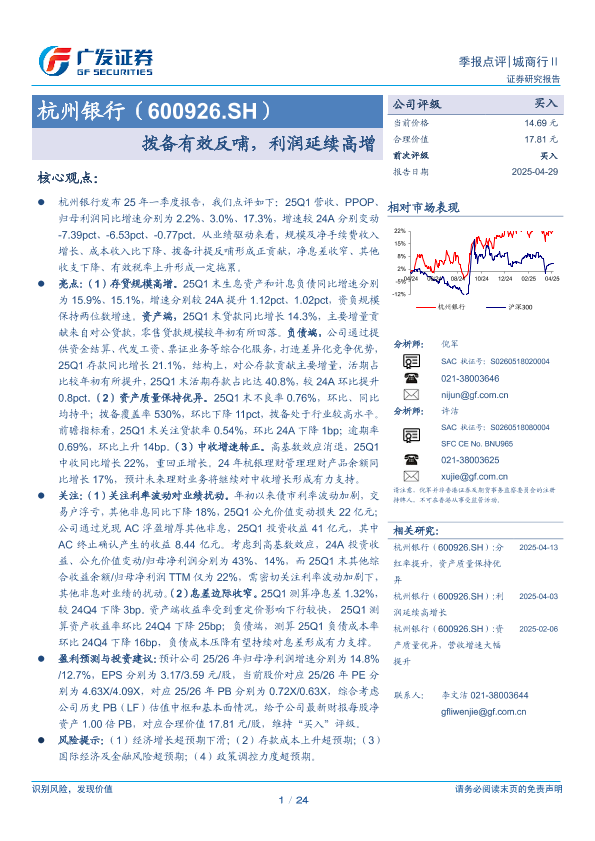 【广发证券】【20250429】杭州银行(600926)拨备有效反哺,利润延续高增-24页