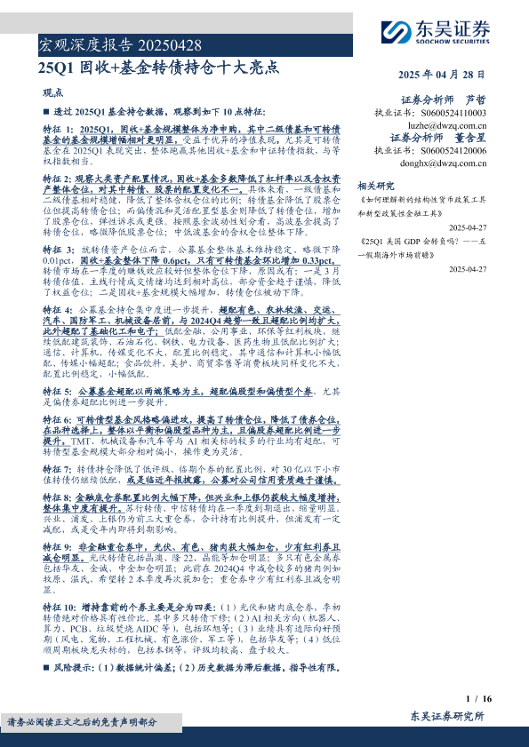 【东吴证券】【20250428】25Q1固收+基金转债持仓十大亮点-16页
