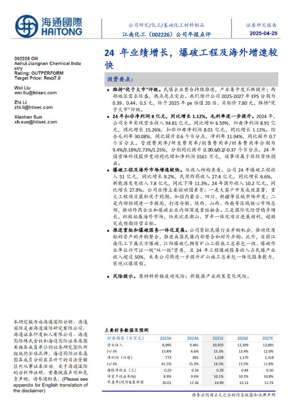 【海通国际】【20250425】江南化工公司年报点评:24年业绩增长,爆破工程及海外增速较快-12页