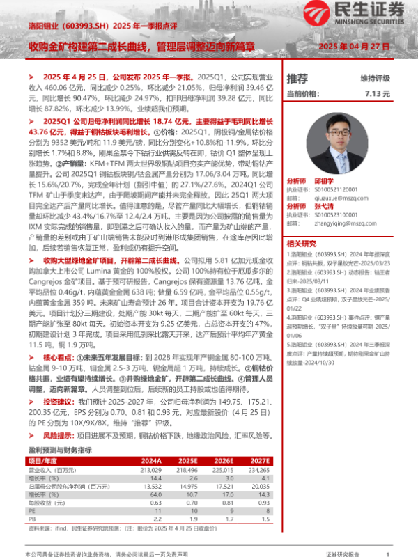 【民生证券】【20250427】洛阳钼业2025年一季报点评:收购金矿构建第二成长曲线,管理层调整迈向新篇章-18页