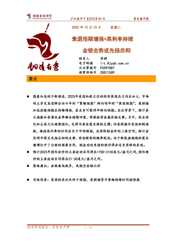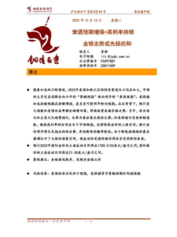 【铜冠金源期货】【20221213】贵金属年报:衰退预期增强+高利率持续,金银走势或先扬后抑-31页