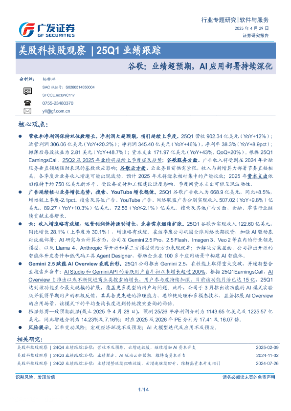 【广发证券】【20250429】软件与服务行业美股科技股观察|25Q1业绩跟踪:谷歌,业绩超预期,AI应用部署持续深化-14页
