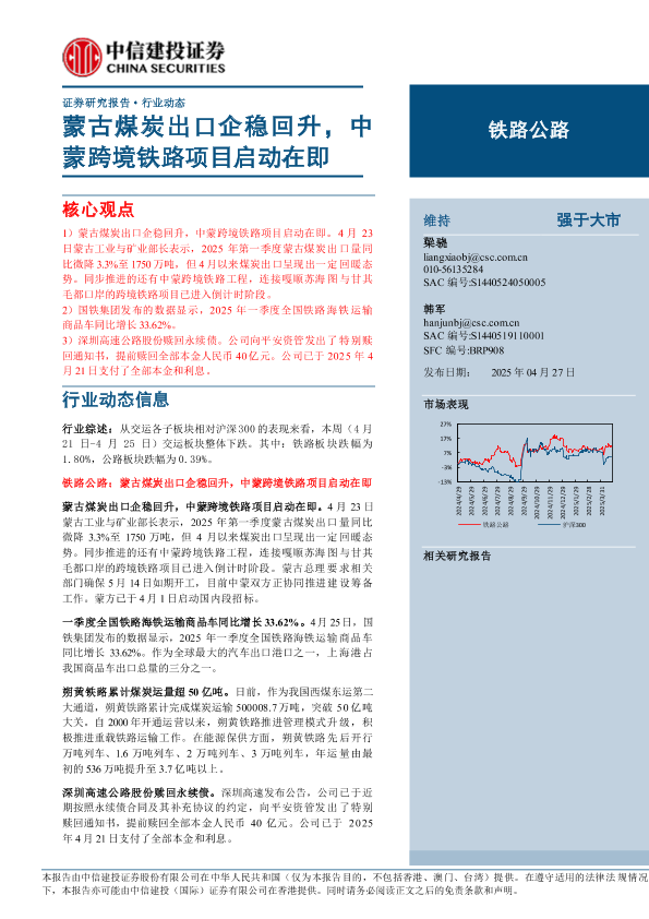 【中信建投证券】【20250427】铁路公路行业:蒙古煤炭出口企稳回升,中蒙跨境铁路项目启动在即-12页