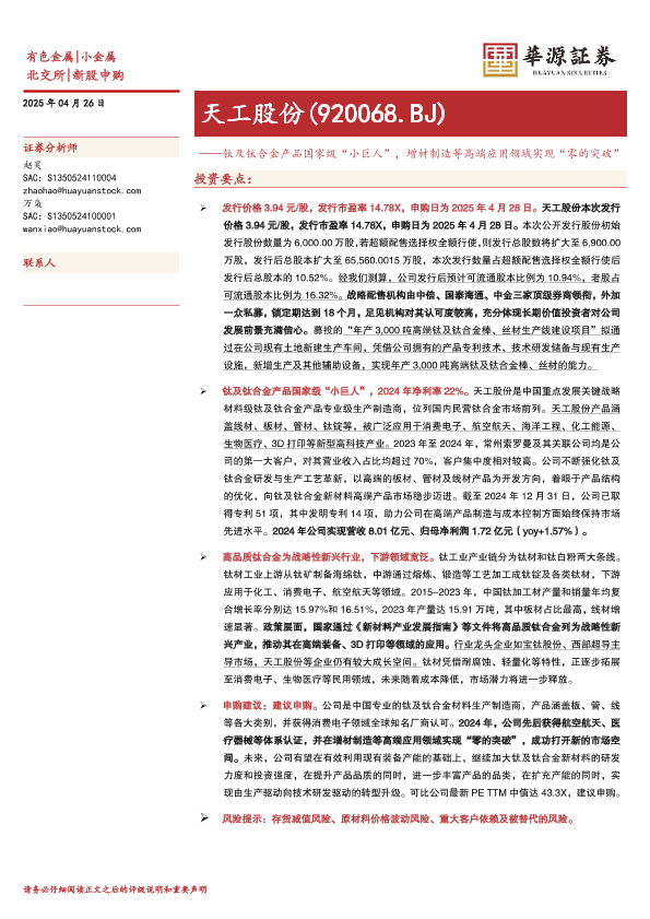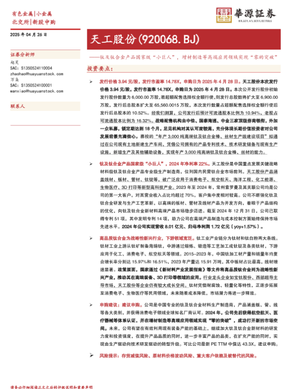 【华源证券】【20250426】天工股份(920068)钛及钛合金产品国家级“小巨人”,增材制造等高端应用领域实现“零的突破”-17页