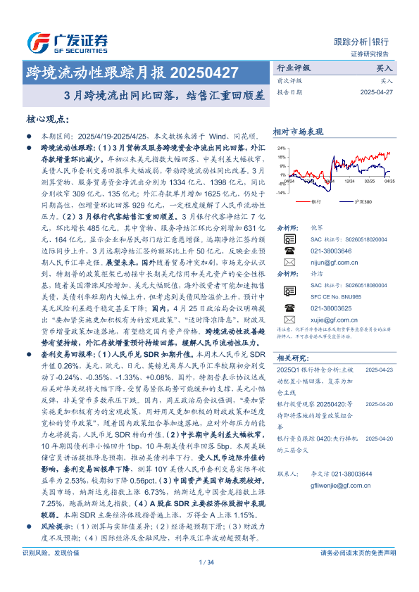 【广发证券】【20250427】银行业跨境流动性跟踪月报:3月跨境流出同比回落,结售汇重回顺差-34页