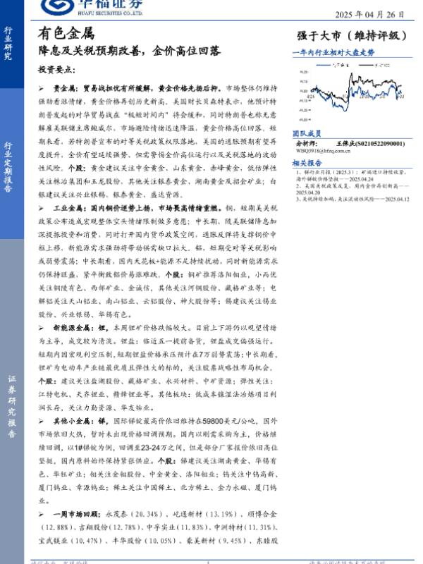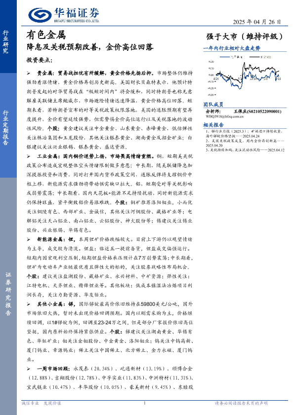 【华福证券】【20250426】有色金属行业定期报告:降息及关税预期改善,金价高位回落-16页