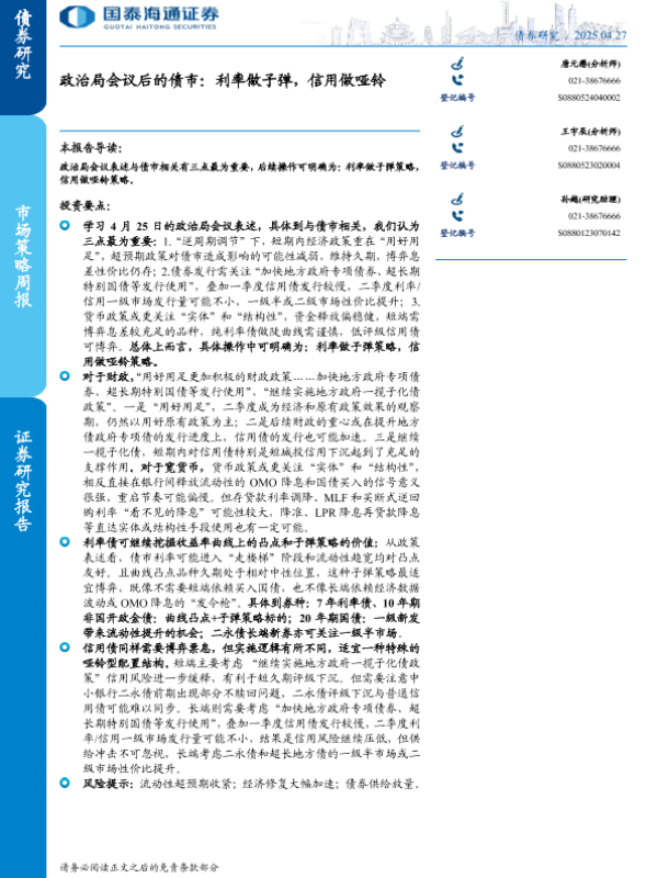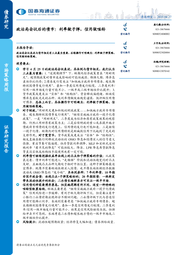 【国泰海通证券】【20250427】政治局会议后的债市:利率做子弹,信用做哑铃-11页