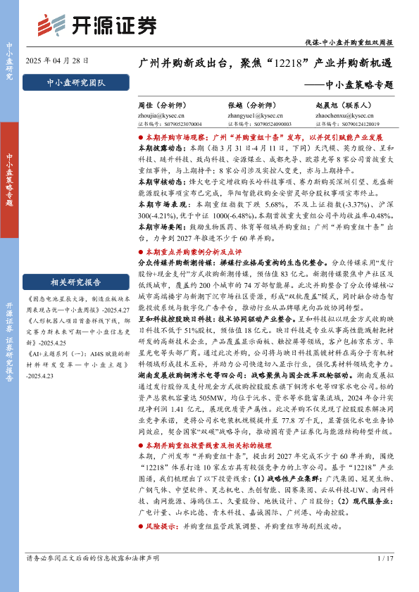 【开源证券】【20250428】中小盘策略专题:广州并购新政出台,聚焦“12218”产业并购新机遇-17页