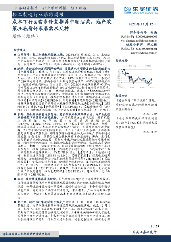 【东吴证券】【20221212】轻工制造行业跟踪周报:成本下行&需求修复推荐中顺洁柔,地产政策托底看好家居需求反转-23页