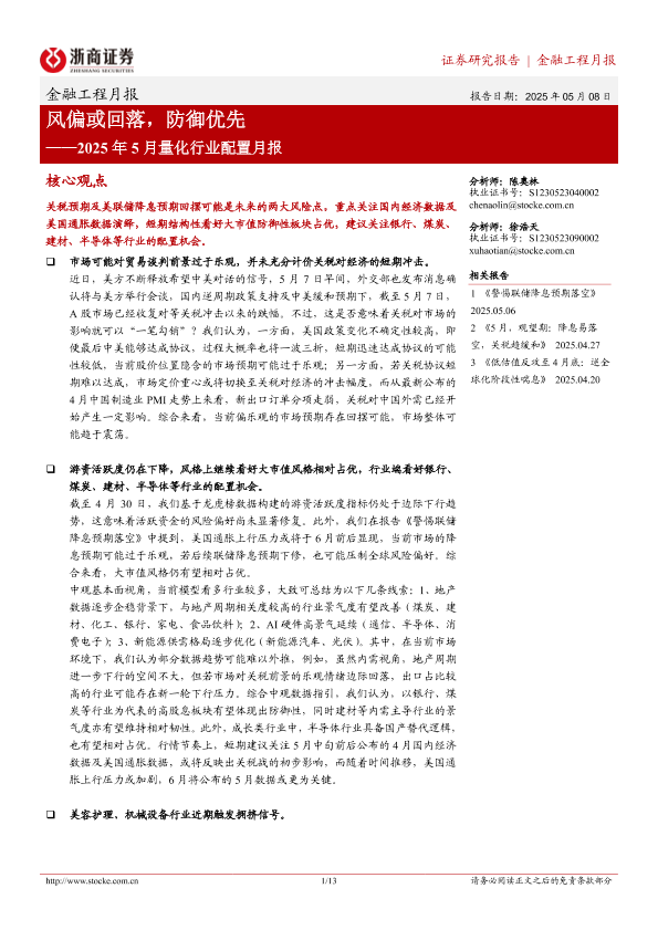 【浙商证券】【20250508】2025年5月量化行业配置月报:风偏或回落,防御优先-13页