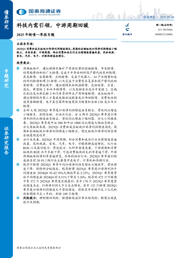 【国泰海通证券】【20250506】2025年转债一季报专题:科技内需引领,中游周期回暖-15页