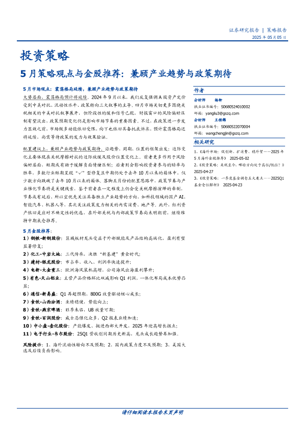 【国盛证券】【20250505】5月策略观点与金股推荐:兼顾产业趋势与政策期待-15页