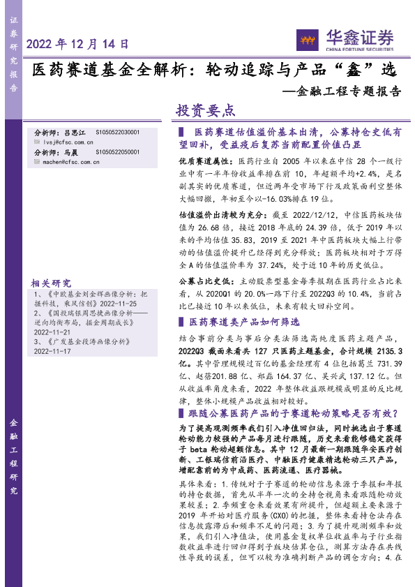 产品优选 投资分析 轮动策略 金融工程 医药基金