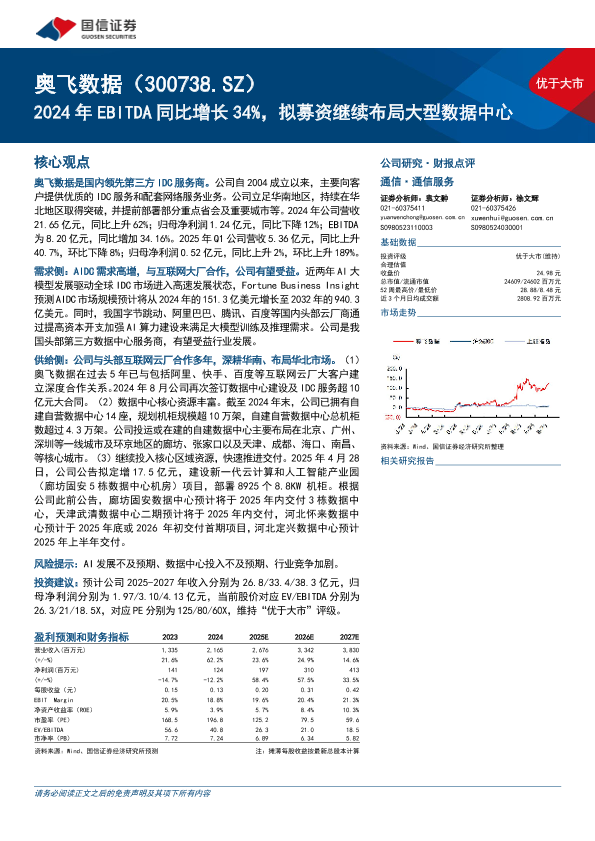 【国信证券】【20240507】奥飞数据2024年EBITDA同比增长34%,拟募资继续布局大型数据中心-18页