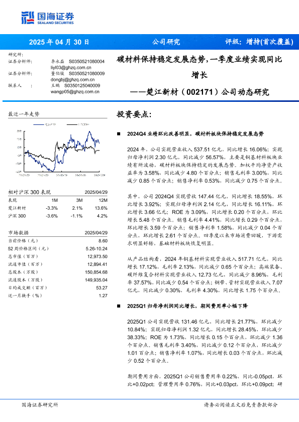 【国海证券】【20250430】楚江新材公司动态研究:碳材料保持稳定发展态势,一季度业绩实现同比增长-10页