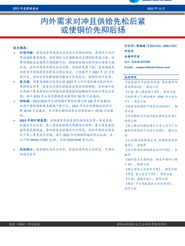【宏源期货】【20221216】铜2023年度策略报告:内外需求对冲且供给先松后紧,或使铜价先抑后扬-20页