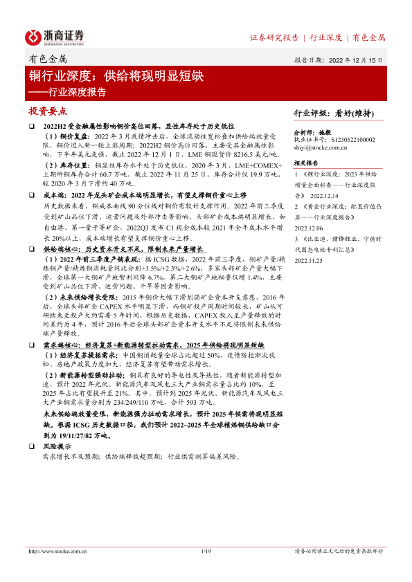 【浙商证券】【20221215】铜行业深度:供给将现明显短缺-19页
